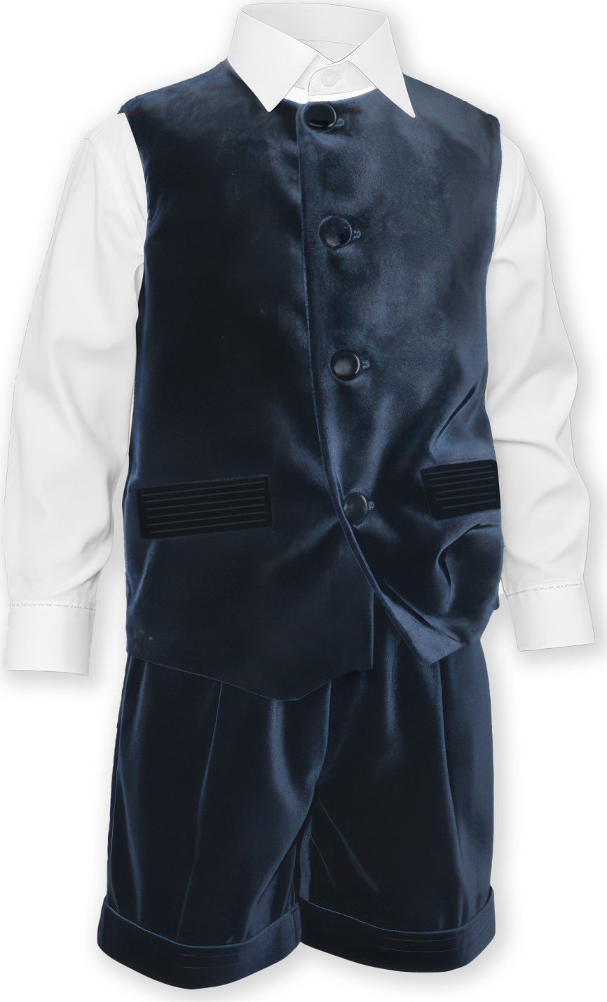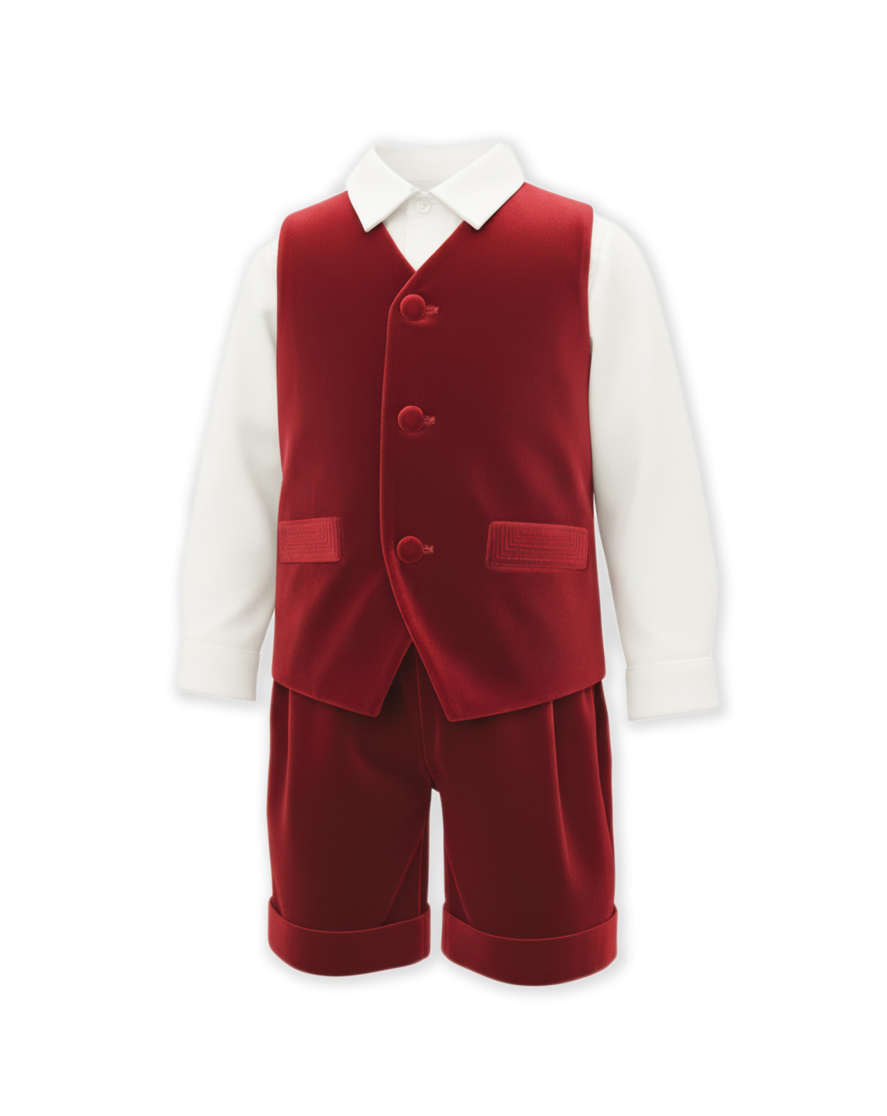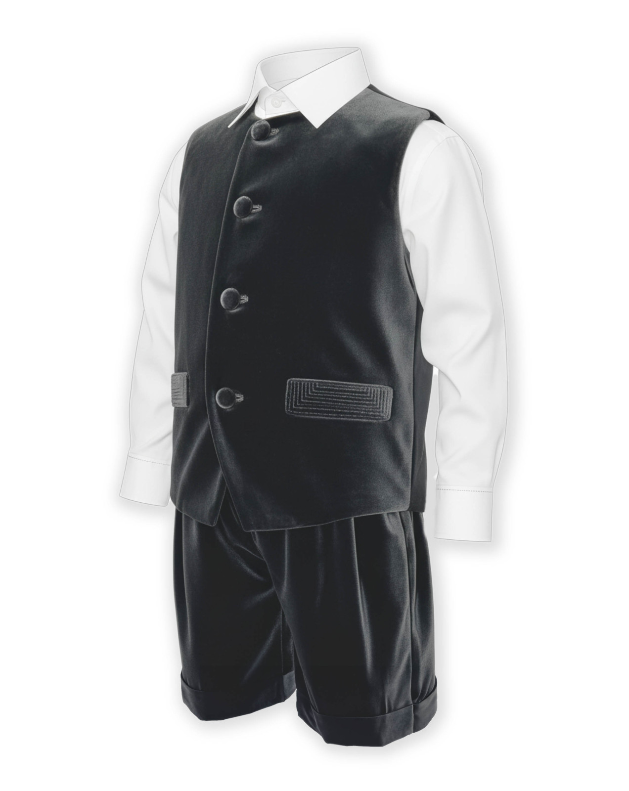 Boy elegant formal suit with vest with round neck and covered buttons and pants with pleats in English style. Also available with long pants. A perfect suit for your child for weddings, communions, parties and any special occasion.