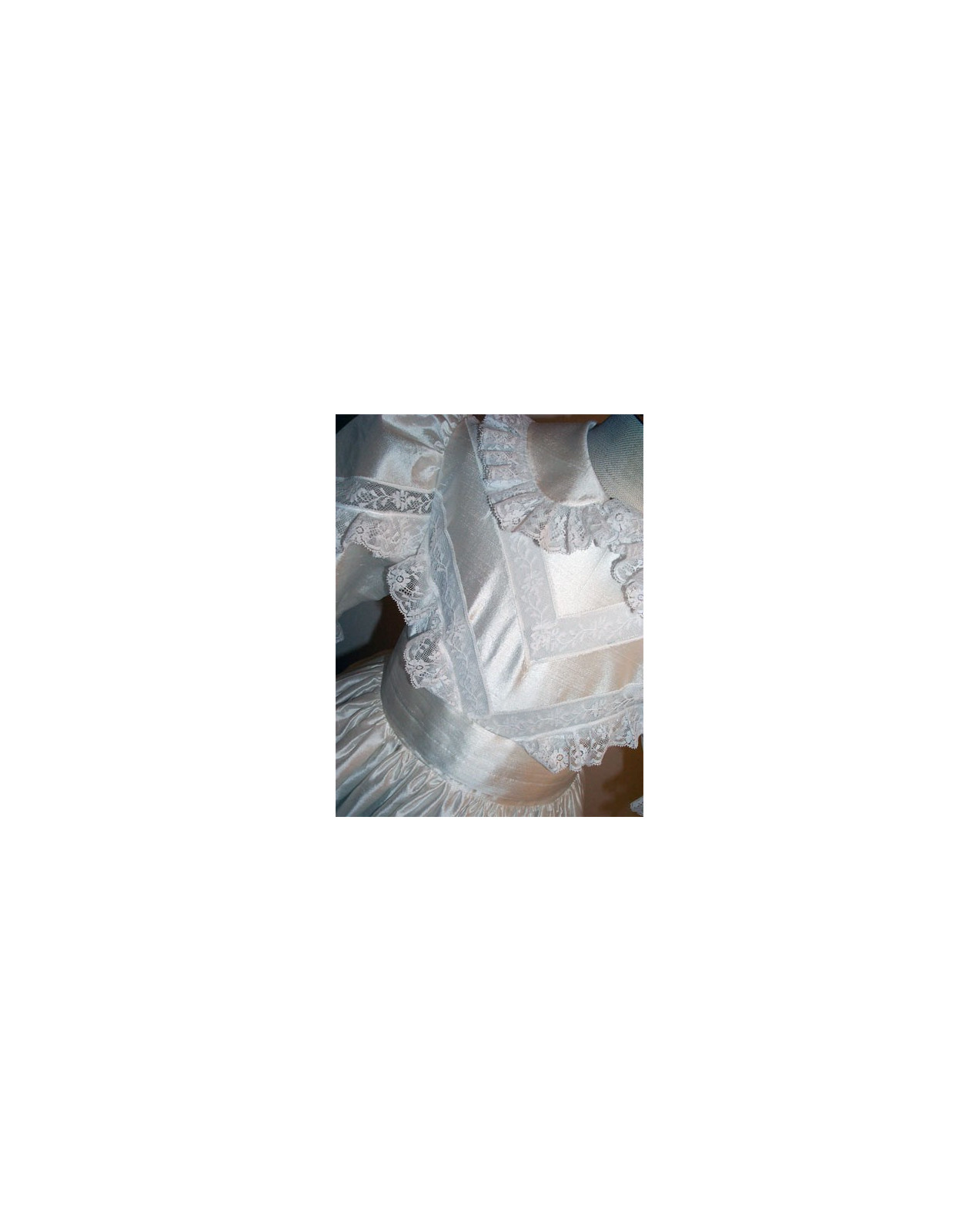 Regarding the color palette, in addition to traditional bright white and ivory, we offer the possibility of creating the gown in various other shades upon request. A signature feature of our design is the sophisticated contrast: regardless of the color chosen for the main fabric, the exquisite trimmings and lace always remain strictly white or ivory. This detail gives the garment an unmistakable aesthetic signature, creating a point of light that enhances the artisanal craftsmanship of the silk.