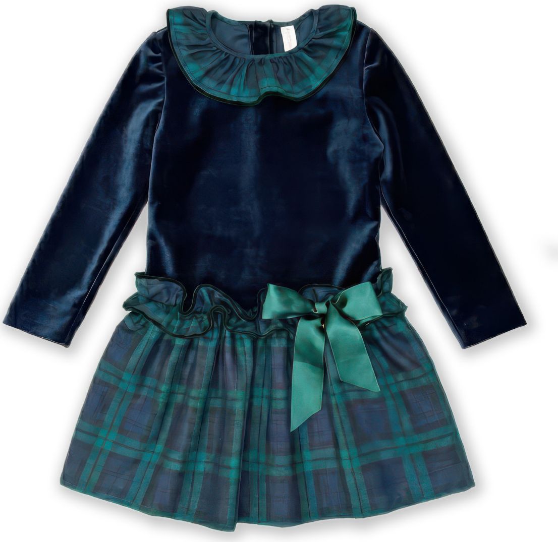 The velvet bodice enhances the silhouette with a refined finish, while the tartan skirt adds movement and a classic touch of style.