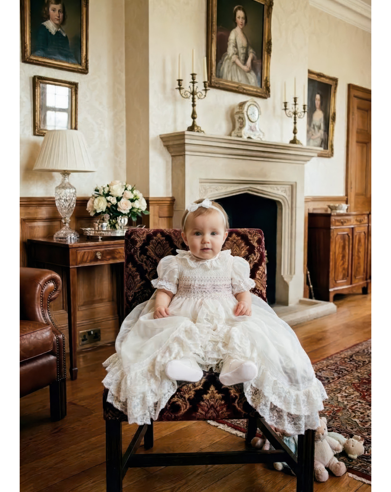 Il corpetto è un inno all'artigianalità: un fitto punto smock eseguito interamente a mano, arricchito da delicati ricami floreali in sfumature rosa pastello e verde salvia. Ogni dettaglio è studiato per la perfezione: dai raffinati pizzi Valenciennes che profilano lo scollo a volant e le maniche a palloncino, fino alla cascata di balze che decora la gonna.