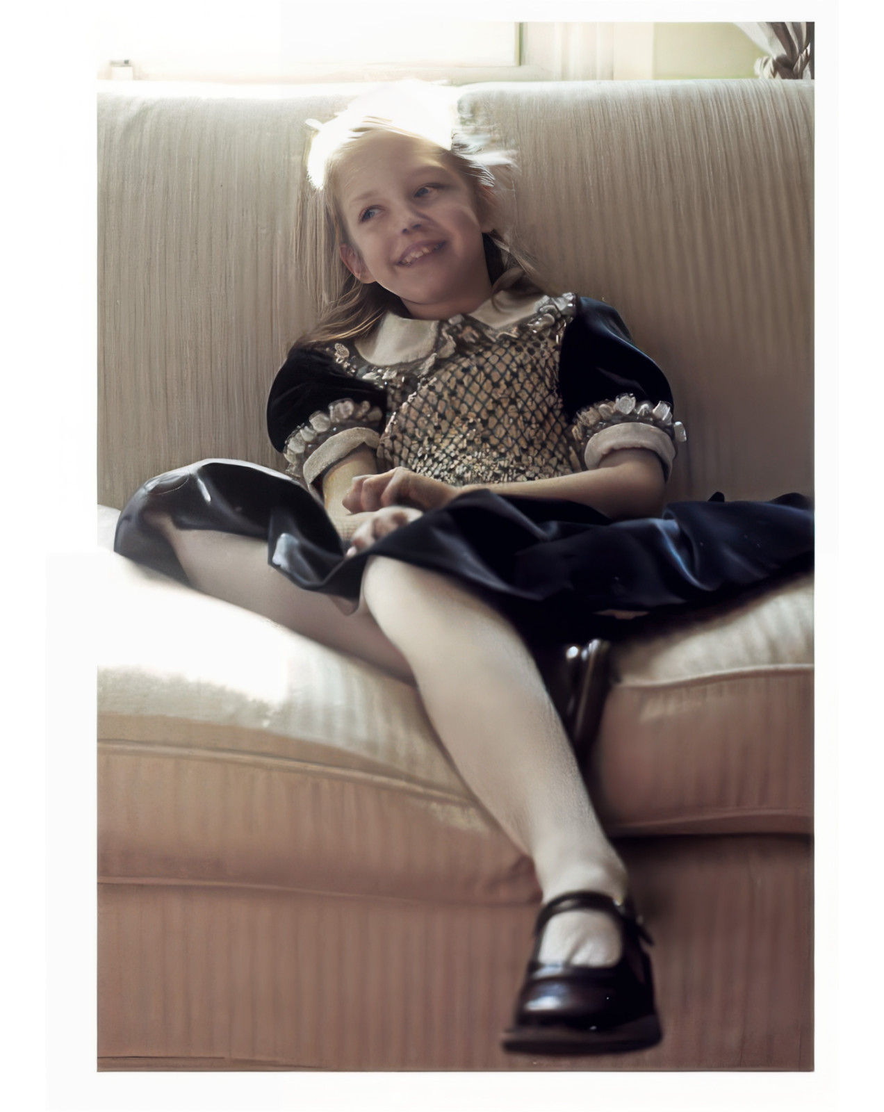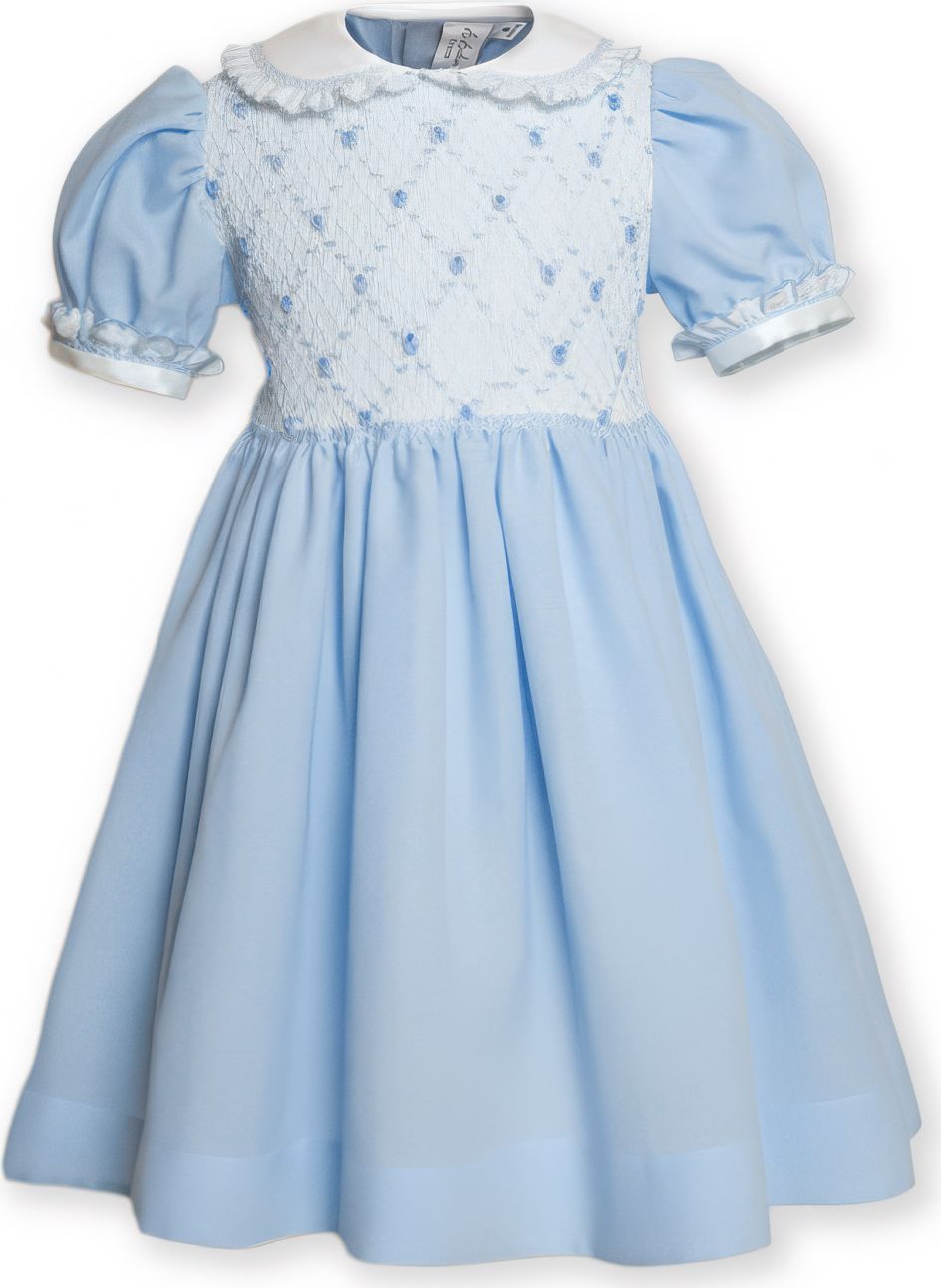 Uno splendido abito per bambina realizzabile in velluto, seta oppure satin di cotone, Il corpetto  in tessuto chiaro in contrasto e lavorato con un fitto smock e ricamato in armonia con il colore  del tessuto prescelto. I risvolti delle maniche e collo sono realizzati nello stesso tessuto del corpetto e rifiniti con smerlo e smock. Un abito prezioso da favola per momenti speciali di una bambina.