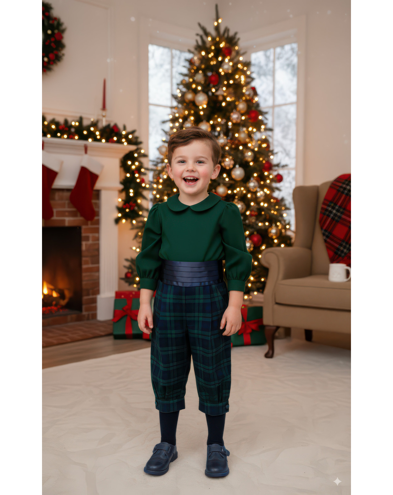 Completo elegante per bambino per ogni tipo di cerimonia. Il completo è composto da pantalone (alla zuava, corto o lungo ) in tartan scozzese di lana, foderato all'interno; camicia in morbido velluto lisci di cotone; fascia in vita di shantung di seta , chiusa dietro con comodo velcro. E' l' abito per un bambino chic in occasione di matrimoni o eventi speciali.